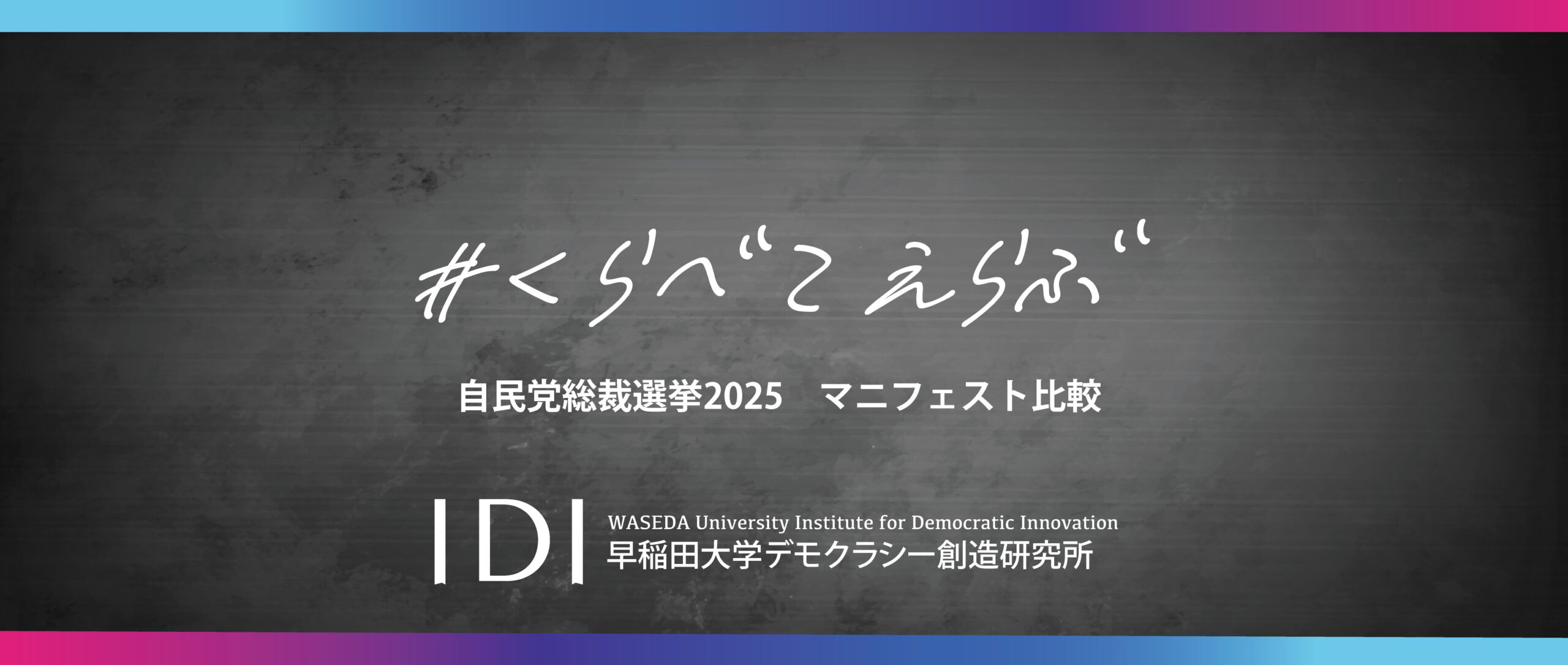 早稲田大学デモクラシー創造研究所※(旧マニフェスト研究所/所長・日野 愛郎 早稲田大学政治経済学術院教授)は、2025年自民党総裁選挙における候補者マニフェストを比較するウェブサイト「#くらべてえらぶ」を公開しました。