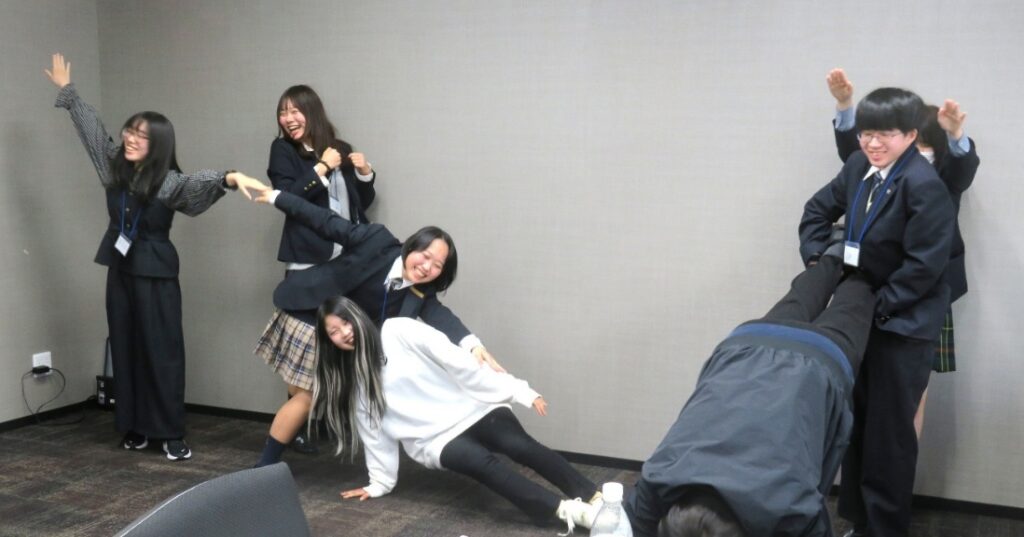 遠くは九州から13名の高校生が参加し、お互いが初対面だが、次第に緊張が解けて、いきなり『滑り台』と言われて即、形にしたパフォーマンスは先々鮮明な記憶と自信になって残るのではないか。
