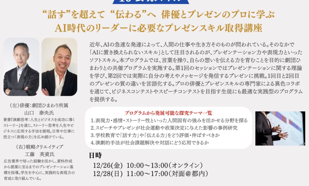 ALL学生記者クラブ(主催:途中塾)は早大デモクラシー創造研究所の協力のもと、人材育成塾・リザプロと協働して、年末の2日間、高校生を対象に「AI時代のリーダーに必要な表現とプレゼンテーション」を学ぶ講座を開いた。