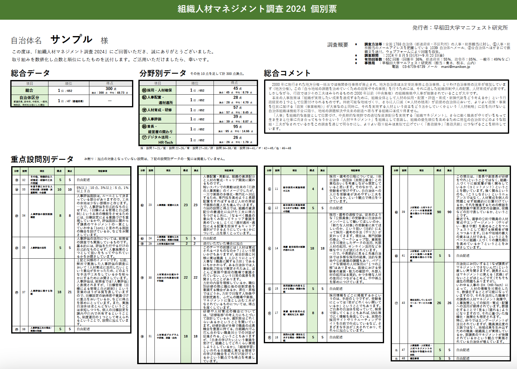 なお、回答元には下記の「個別票」(得点と順位・重点ポイントの解説を記載)および1位・自組織・平均を比較した「レーダーチャート」を個別送付しています。